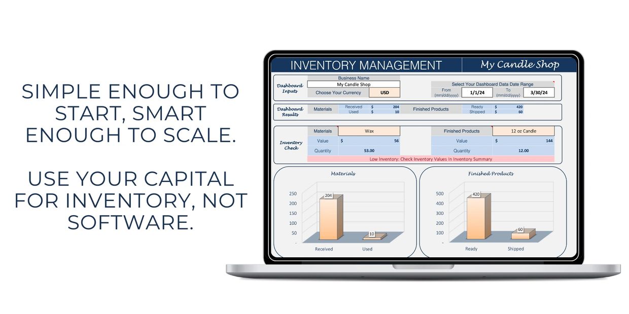 Complete inventory lifecycle tracking from raw materials received through finished product shipping. Selection menus and automated calculations streamline operations while maintaining professional inventory records for business growth.